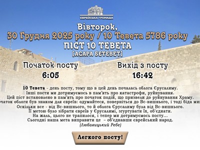 🟡 Сенс дняДесяте Тевета — один із постів, пов’язаних із руйнуванням Храму. Саме цього дня вавилоняни розпочали облогу Єрусалима — подію, з якої почався трагічний ланцюг, що завершився руйнуванням Першого Храму.У хасидській традиції цей день сприймають не лише як час скорботи, а й як момент внутрішнього пробудження та виправлення — крок на шляху до визволення і майбутнього відновлення Храму.Короткі закони посту🥛 Їжа і пиття до світанку🟡 Якщо людина не лягала спати — вона може їсти й пити до сходу зорі.🟡 Якщо лягає спати і планує прокинутися рано, щоб поїсти — потрібно заздалегідь мати намір поїсти перед сном.🟡 Тим, хто зазвичай п’є воду або чай після пробудження, не потрібно робити особливої умови.Діти, які вже розуміють сенс посту, не постять повністю — їм дають просту й скромну їжу, без ласощів і солодощів.🙏 Ранкова молитва і «Сліхот»У Шахарит хазан промовляє вставку на піст «Анейну» в повторенні аміди як окреме благословення — якщо в синагозі є принаймні кілька тих, хто постить.«Сліхот» читають стоячи, особливо:🟡 «Ашамну»,🟡 13 якостей милосердя,🟡 «Шма колейну»,🟡 «Авіну Малкейну».📖 Читання ТориУ Шахарит і Мінху читають розділ «Ваїхаль».Навіть якщо постять лише троє людей — читання Тори все одно проводять.Тих, хто не дотримується посту, за можливості не викликають до читання Тори.💧 Мінха і молитва «Анейну»Під час Мінхи:🟡 читають Тору та гафтара «Діршу А-Шема беhімацо»,🟡 потім — аміду.Кожен, хто постить, у «Шма колейну» додає «Анейну».Якщо забув — можна сказати її наприкінці молитви перед «Єї рацон».У місцях, де благословення коенів читають щодня, його також промовляють у Мінсі, якщо молитва відбувається після «плаг а-мінха».Після Мінхи прийнято говорити короткі слова духовного пробудження — «діврей кібушин».🤲 Цдака і внутрішній сенс дняУ день посту прийнято давати цдаку — на знак того, що суть посту не в позбавленні тіла, а у виправленні серця та вчинків.У хасидському вченні підкреслюється:цей день — не лише пам’ять про руйнування, а й початок духовного процесу відновлення,підготовка до майбутнього Храму та до Визволення.Легкого постуджерело: 📖 Любавицький календар